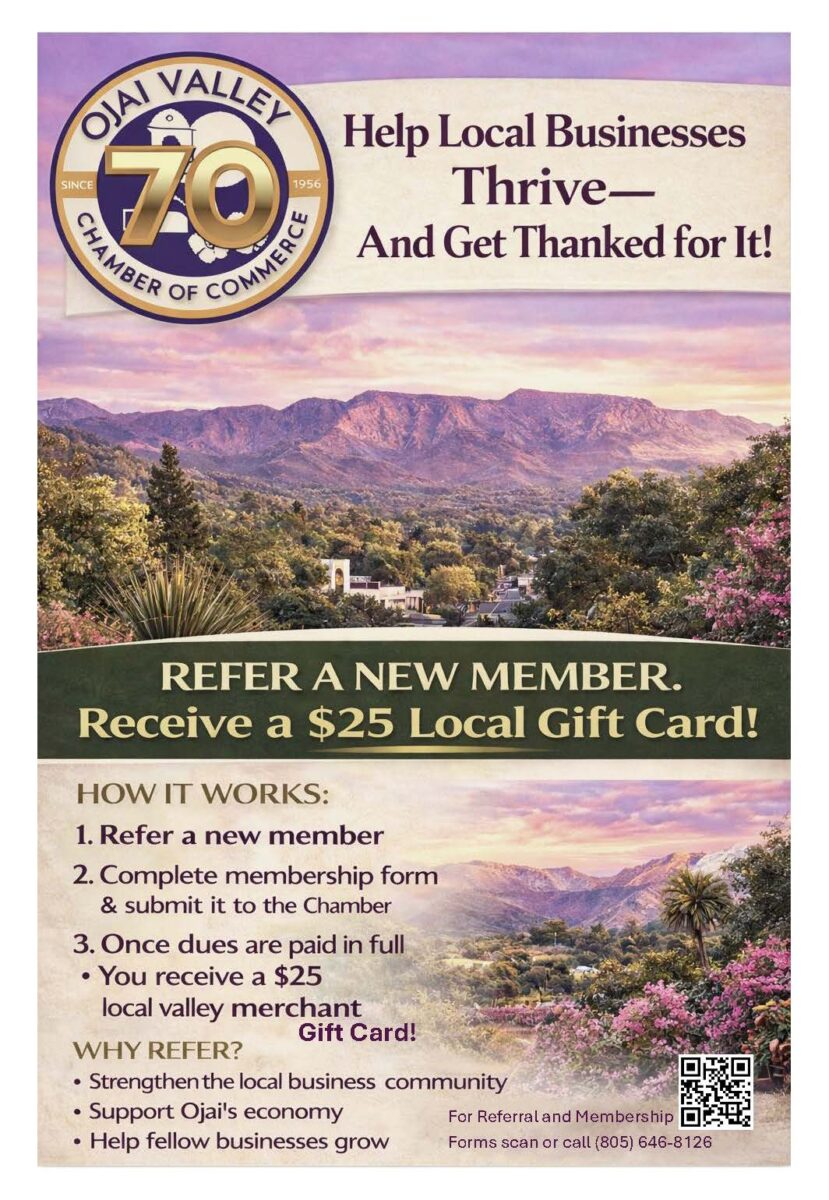 Refer a person or business to become a new member of the Ojai Valley Chamber of Commerce and receive a $25 gift card for each new member.